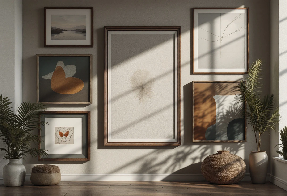 Regrouper plusieurs cadres sur un pan de mur transforme instantanément une pièce. Le carillon à vent ajoute ensuite une dimension sensorielle inédite, grâce à son mouvement et sa douce musique. La juxtaposition de ces univers évoque la créativité, l’artisanat et l’harmonie.
